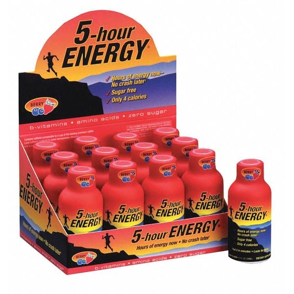 The 5Hour Energy drink is a popular energy supplement that comes in a small 2 oz container It differs from other energy drinks in that it contains no net carbs or sugar and only a small amount of caffeine This product contains a blend of several ingredients, some of which include Bvitamins, amino acids and caffeineWhen you take a Berryflavored Regular Strength 5Hour ENERGY® shot, you can again feel alert and energized within minutes of the berry flavor touching your lips For the next few hours, you'll be able to dive back into your work or responsibilities feeling revitalized and ready to tackle whatever lays aheadOne shot provides hours worth of energy, yet it contains